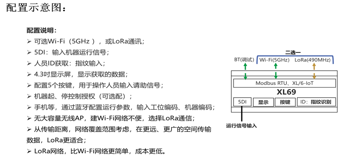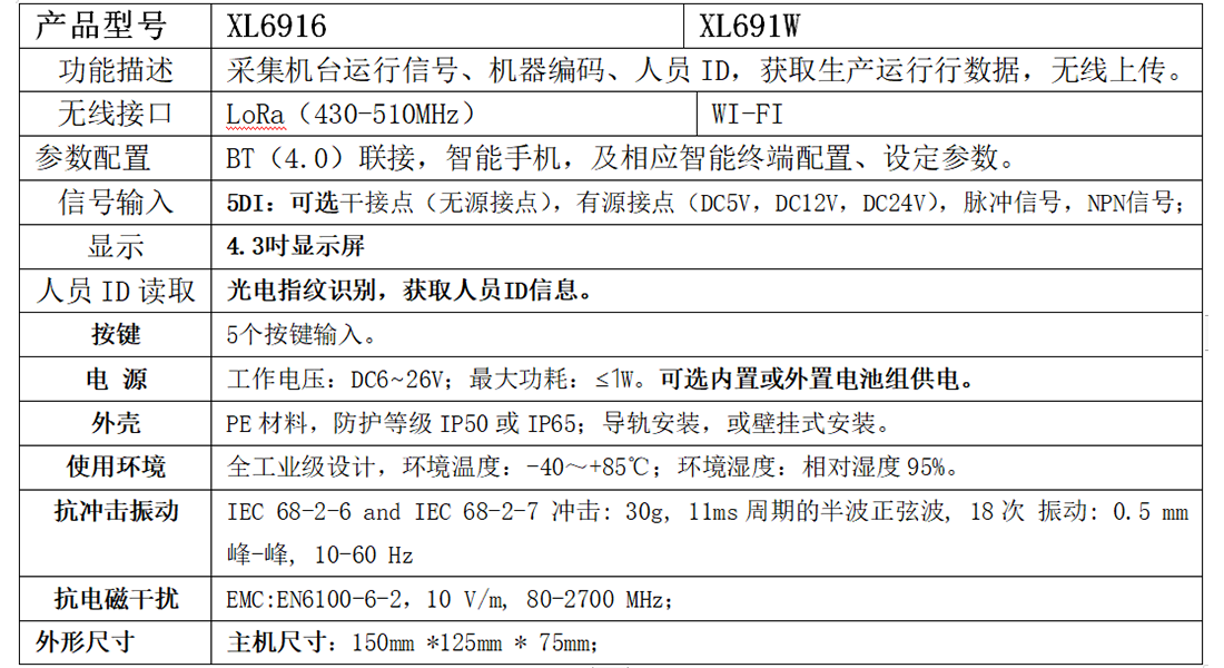 XL69機臺監(jiān)控裝置,采集機臺、工位人、機生產(chǎn)運行信號:機器運行狀態(tài)、人員ID信息及操作時間數(shù)據(jù),獲取機器、人員生產(chǎn)運行數(shù)據(jù),并對機臺的運行數(shù)據(jù)進(jìn)行邊緣計算,統(tǒng)計、分析機臺的設(shè)備效率、時間效率、品質(zhì)效率,及綜合效率。通過無線方式,上傳獲取的數(shù)據(jù)。